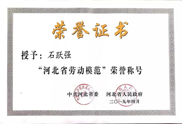 王啟良副主席在迎賓大廳宣讀了中共河北省委、河北省人民政府對石躍強(qiáng)同志的表彰決定,并與石總持獎(jiǎng)?wù)潞妥C書在普陽辦公樓前廳合影留念。
