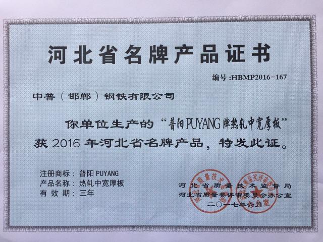 我公司“熱軋中寬厚板”榮獲“2016年河北省名牌產(chǎn)品”稱號(hào)