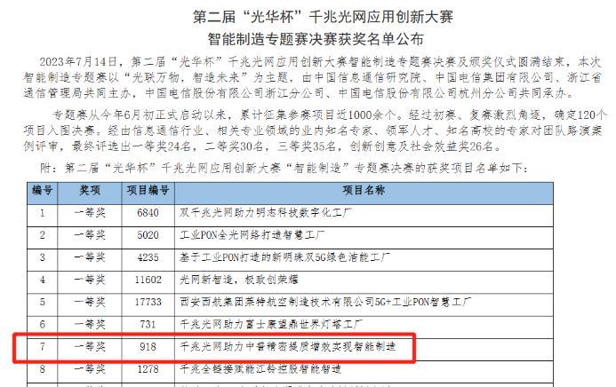 ?? “光華杯”千兆光網(wǎng)應(yīng)用創(chuàng)新大賽是工業(yè)和信息化部重要的年度賽事,旨在推動(dòng)千兆光網(wǎng)技術(shù)在各個(gè)領(lǐng)域的創(chuàng)新應(yīng)用。本次智能制造專題賽經(jīng)歷了初賽、復(fù)賽和決賽三輪比拼,由信息通信行業(yè)及相關(guān)專業(yè)領(lǐng)域的知名專家、行業(yè)領(lǐng)軍人才、知名大學(xué)教授等嚴(yán)格評(píng)審,中普精密的項(xiàng)目在120個(gè)決賽項(xiàng)目中經(jīng)過激烈的競(jìng)爭(zhēng)脫穎而出,獲得了專家的高度認(rèn)可。