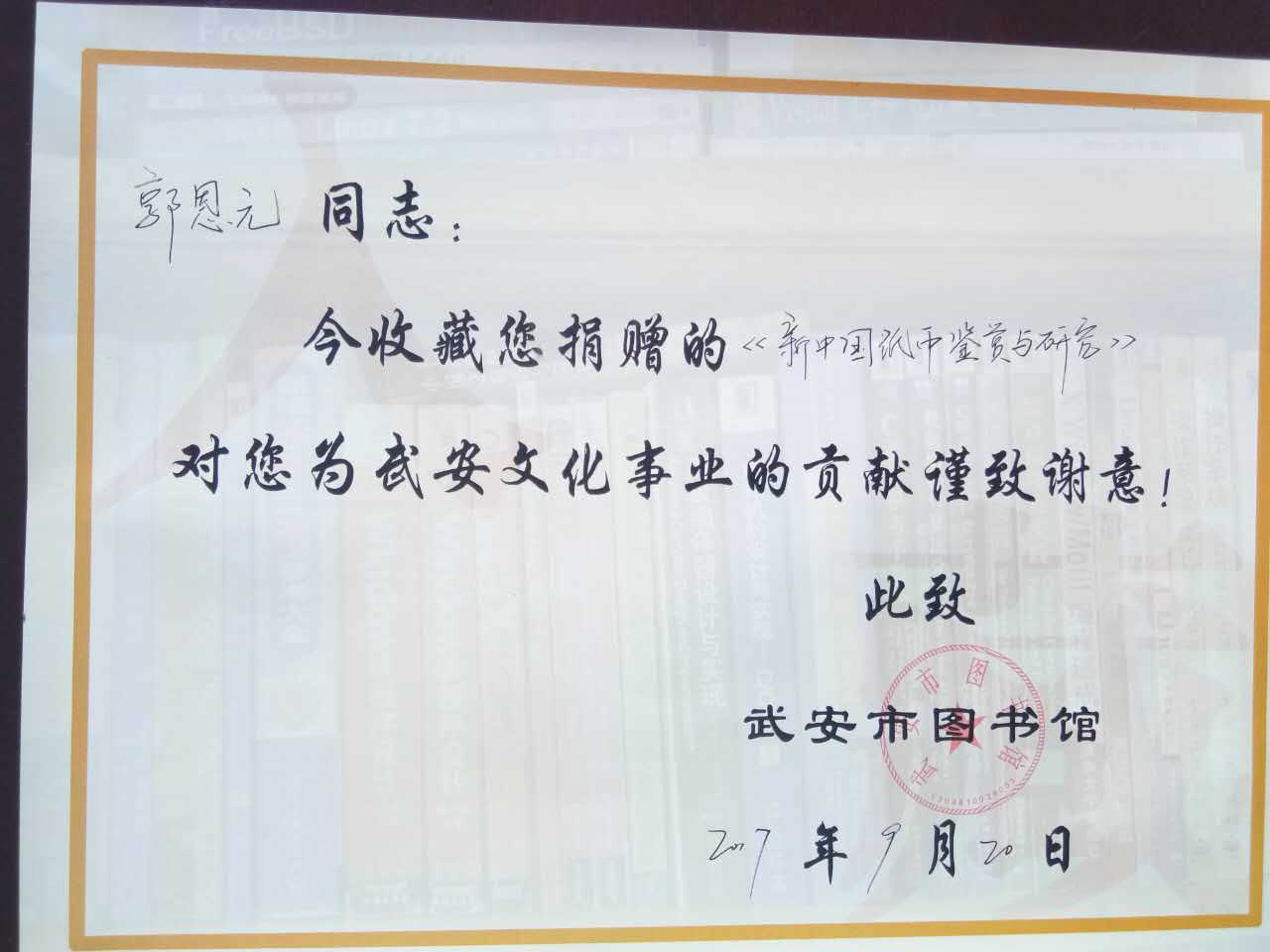 近日,由我公司董事長郭恩元牽頭編纂的《新中國紙幣鑒賞與研究》一書,被武安市圖書館收藏。