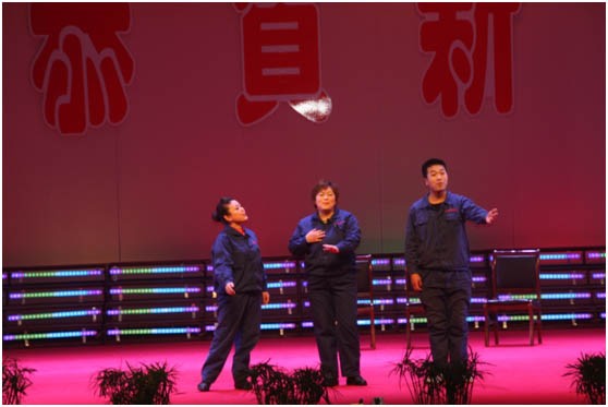 小品《選舉》將“6S”現(xiàn)場管理與“說學逗唱”巧妙地融為一體,諷刺了個別單位在選舉勞模時的“暗箱操作”,的做法,最終以公平、公正贏得了大家的一致認可。這個節(jié)目很接“地氣”,可謂是“寓教于樂”意義深遠。《太極響扇》動作優(yōu)美、柔中帶剛?!缎沦F妃醉酒》讓大家體會了一把“夢回唐朝”。紅遍全球的“騎馬舞”《江南Style》以其激昂的音樂和動感的舞姿,讓全廠的觀眾都“嗨”了起來。豫劇聯(lián)唱則讓愛好戲曲的朋友過了把戲癮。《夫妻情》的創(chuàng)意別具匠心,4對平凡的普陽“小兩口”登上舞臺與大家見面,顯現(xiàn)了企業(yè)繁榮興旺、家庭和諧幸福。隨后,晚會在歌舞聯(lián)唱《東西南北大拜年》中落下帷幕。