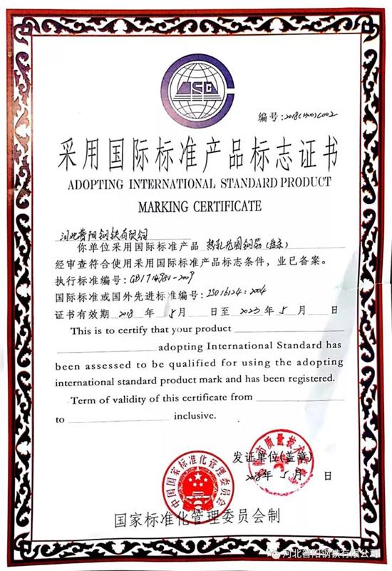 近日,經(jīng)過國家標(biāo)準(zhǔn)化管理委員會(huì)、河北省質(zhì)量技術(shù)監(jiān)督局的嚴(yán)格檢驗(yàn)以及行業(yè)專家對(duì)產(chǎn)品實(shí)物質(zhì)量與國外同類產(chǎn)品質(zhì)量性能指標(biāo)的比較評(píng)估,核定我公司生產(chǎn)的熱軋光圓鋼筋(盤條)指標(biāo)完全符合國際標(biāo)準(zhǔn)要求,質(zhì)量達(dá)到國際先進(jìn)水平,國家標(biāo)準(zhǔn)化管理委員會(huì)、河北省質(zhì)量技術(shù)監(jiān)督局特授予《采用國際標(biāo)準(zhǔn)產(chǎn)品標(biāo)志證書》和《采用國際標(biāo)準(zhǔn)認(rèn)可證書》。這標(biāo)志著我公司的熱軋光圓鋼筋(盤條)順利通過“雙采”認(rèn)證。