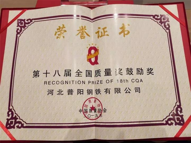 日前,2018年-2019年中國質(zhì)量協(xié)會以“卓越引領(lǐng)——邁入高質(zhì)量發(fā)展新時代”為主題,開展了第十八屆全國質(zhì)量獎評審工作。評審工作堅持“高標準、少而精、樹標桿”的原則,經(jīng)過嚴格的資格審查、資料評審、現(xiàn)場評審、評審委員會審議、網(wǎng)上公示、審定委員會審定并征集相關(guān)部委意見,決定授予河北普陽鋼鐵有限公司“第十八屆全國質(zhì)量獎鼓勵獎”榮譽稱號。