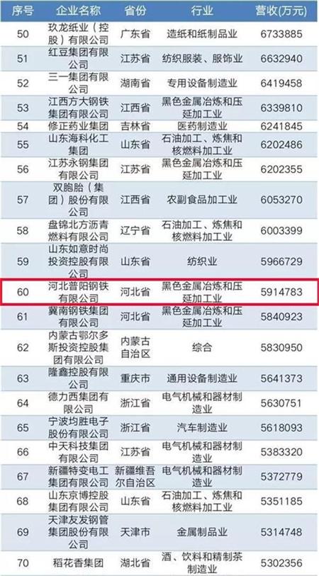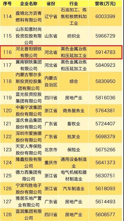 8月22日,全國工商聯(lián)在西寧發(fā)布“2019中國民營企業(yè)500強及民營企業(yè)制造業(yè)500強”榜單。河北普陽鋼鐵集團以2018年銷售收入591.47億元,居2019中國民營企業(yè)500強第116位,中國民營企業(yè)制造業(yè)500強第60位,居武安鋼鐵之首.